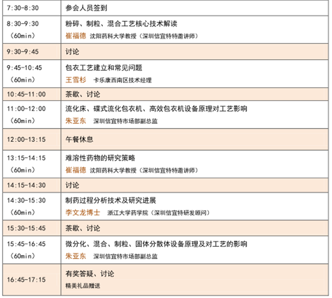 為加強制劑人員對固體制劑工藝及設備原理的理解,特邀請崔福德教授做專場講座,主要介紹固體制劑的制備工藝原理以及難溶性藥物的研究策略,信宜特研發顧問浙大藥學院李文龍博士,將結合信宜特正在開發的光譜成像技術對連續化生產的意義及制藥過程分析技術做深入解讀,同時我們還邀請了卡樂康區域技術服務經理王雪杉,卡樂康作為包衣輔料及技術服務的典范,將著重介紹包衣工藝建立和常見問題分析,信宜特技術人員將著重介紹制劑設備原理對工藝的影響,歡迎制劑相關人員踴躍報名。