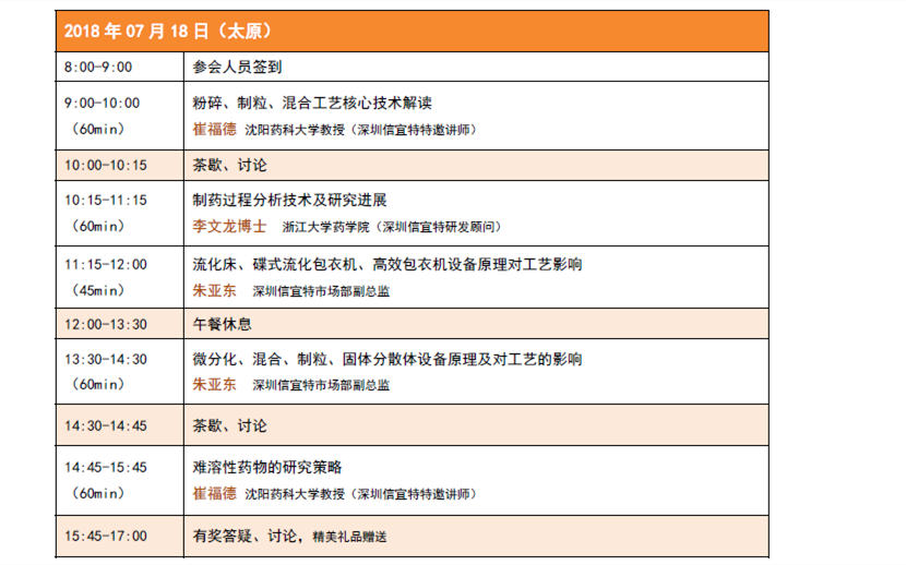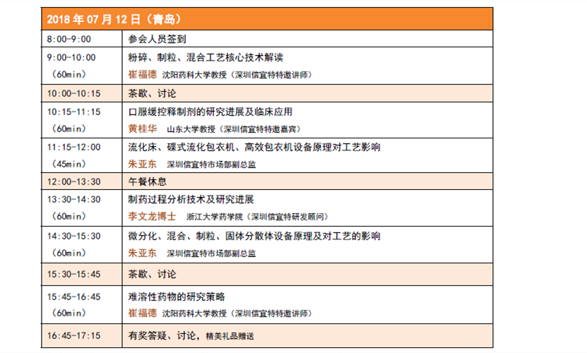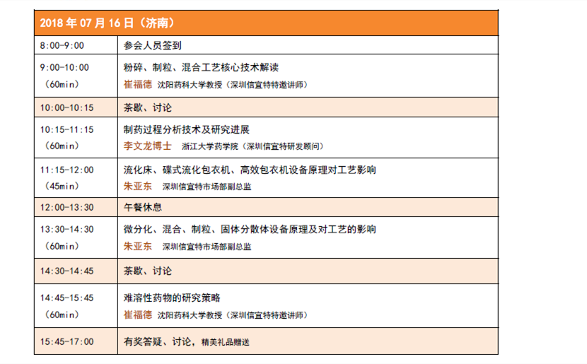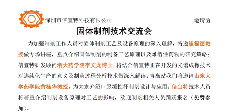 為加強(qiáng)制劑工作人員對固體制劑工藝及設(shè)備原理的深入理解,特邀崔福德教 授做專場講座,重點(diǎn)介紹固體制劑的制備工藝原理以及難溶性藥物的研究策略; 信宜特研發(fā)顧問浙大藥學(xué)院李文龍博士,將結(jié)合信宜特正在開發(fā)的光譜成像技術(shù) 對連續(xù)化生產(chǎn)的意義及制藥過程分析技術(shù)做深入解讀;青島站我們將邀請山東大 學(xué)藥學(xué)院黃桂華教授,為大家介紹口服緩控釋制劑設(shè)計(jì)與應(yīng)用;信宜特技術(shù)人員 將著重介紹制劑設(shè)備原理對工藝的影響,歡迎制劑相關(guān)人員踴躍報(bào)名(免費(fèi)參 加)。